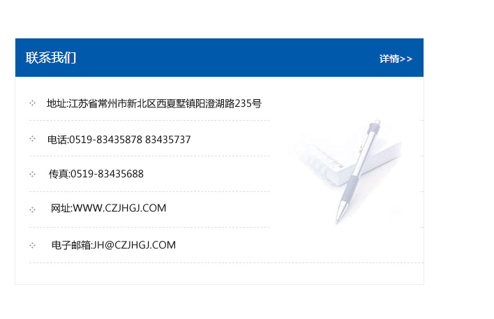 地址:常州市新北區友邦商務大廈1幢16、17層  電話:0519-85101652  傳真:0519-85112595  郵編:213022  網址:www_cz-jiayue_cn.bjjrhs.com  郵箱:xiajifengaa@163.com